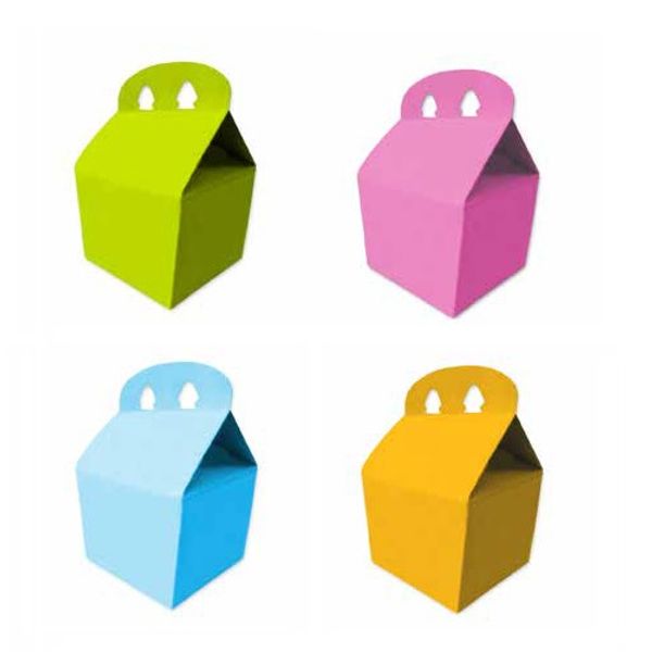 Cajas de cartulina tipo Cajita Feliz con divertidos diseños impresos, o de colores lisos (Celeste, rosa, verde y amarillo).